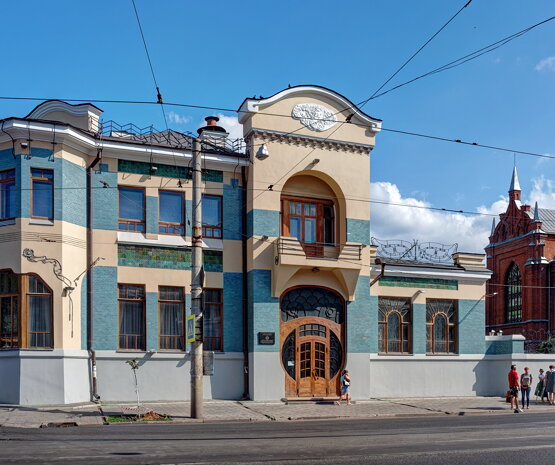 В качестве отделки применена цветная изразцовая плитка. Фасад отделан голубой блестящей плиткой, прекрасно гармонирует по цвету с матовой побелкой цоколя и зелёными вставками из фактурных изразцов. На фасаде присутствует лепнина: женская голова (хозяйки дома) на фронтоне и растение с длинными текучими стеблями над угловым окном. Металлические решётки в виде стилизованных крыльев бабочки, стрекоза на крыше и ажурные ворота придают дому неповторимость и воздушность кованых конструкций.